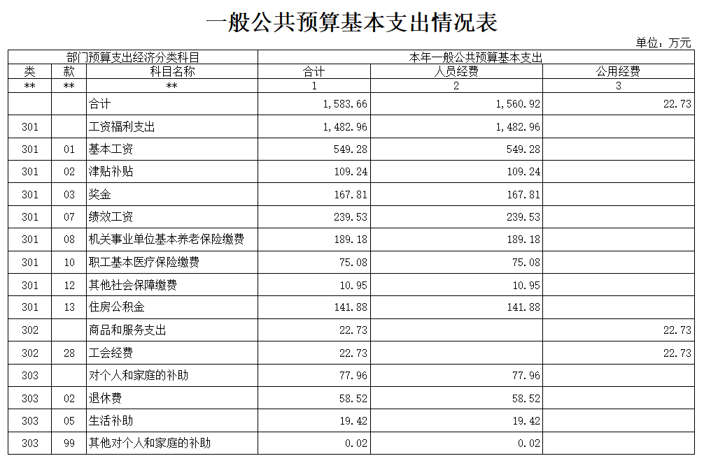 2023年度一般公共预算基本支出1583.66万元,其中:人员经费支出1560.92万元,公用经费支出22.73万元。具体支出预算如下: