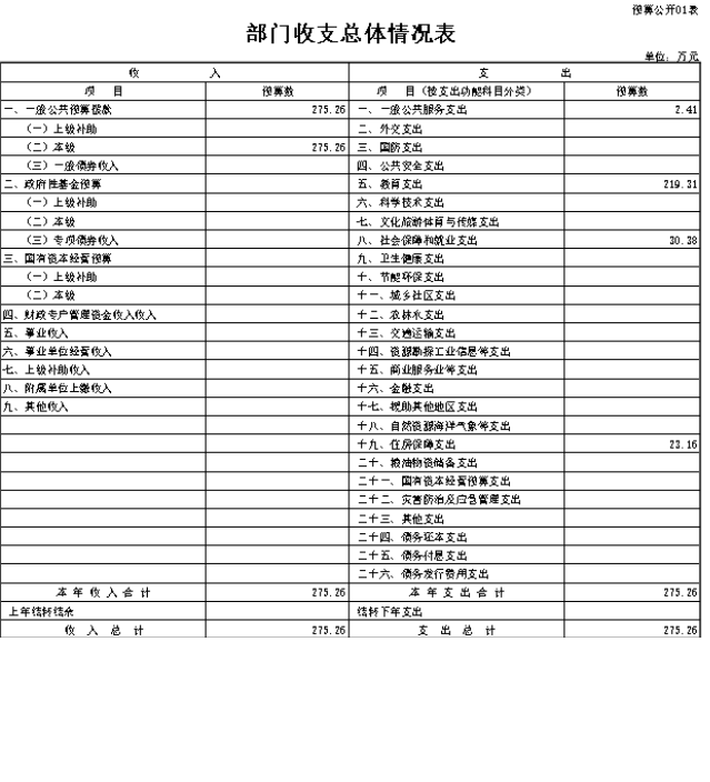 我部门总收入275.26万元,总支出275.26万元(不含财政拨款上年未列支结转收支数)。总收入较上年增长1.57万元,增长0.57%,主要原因是人员增资。总支出较上年增长1.57%,主要原因是人员增资。
