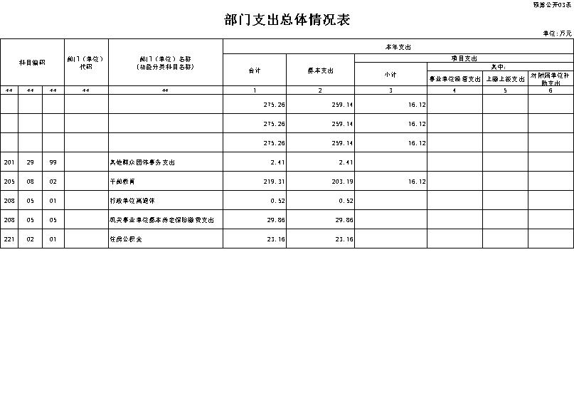 我部门总支出275.26万元,较上年增长1.57万元,增长0.57%,主要原因是人员增资。部门支出包括:其他群众团体事务支出2.41万元,干部教育219.31万元,行政单位离退休0.52万元,机关事业单位基本养老保险缴费支出29.86万元,住房公积金23.16万元。