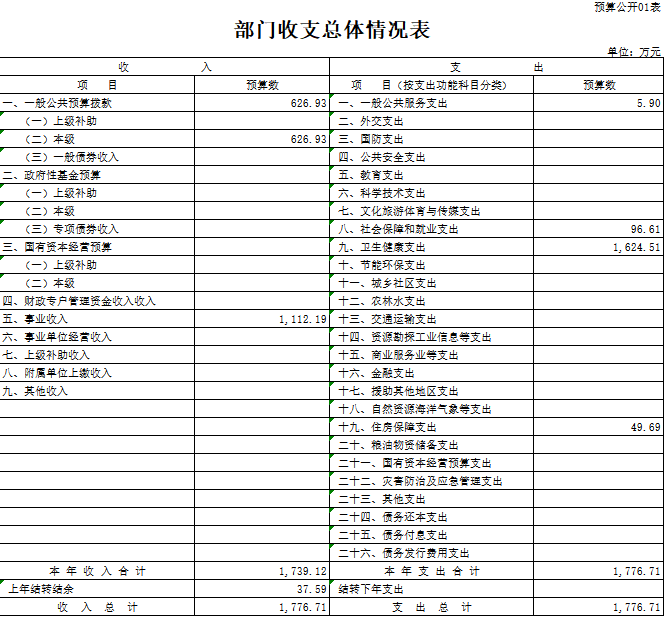 我部门总收入1776.71万元,(一般公共财政预算626.93万元、事业收入预算1112.19万元一般公共预算结转37.59万元),较2024年度预算数1980.66万元,减少203.95万元,下降10.30%,主要原因是医疗业务事业收入的预算与决算偏差较大,单位的医疗业务事业收入存在不确定因素、医疗业务趋势收缩,总额预算收缩,